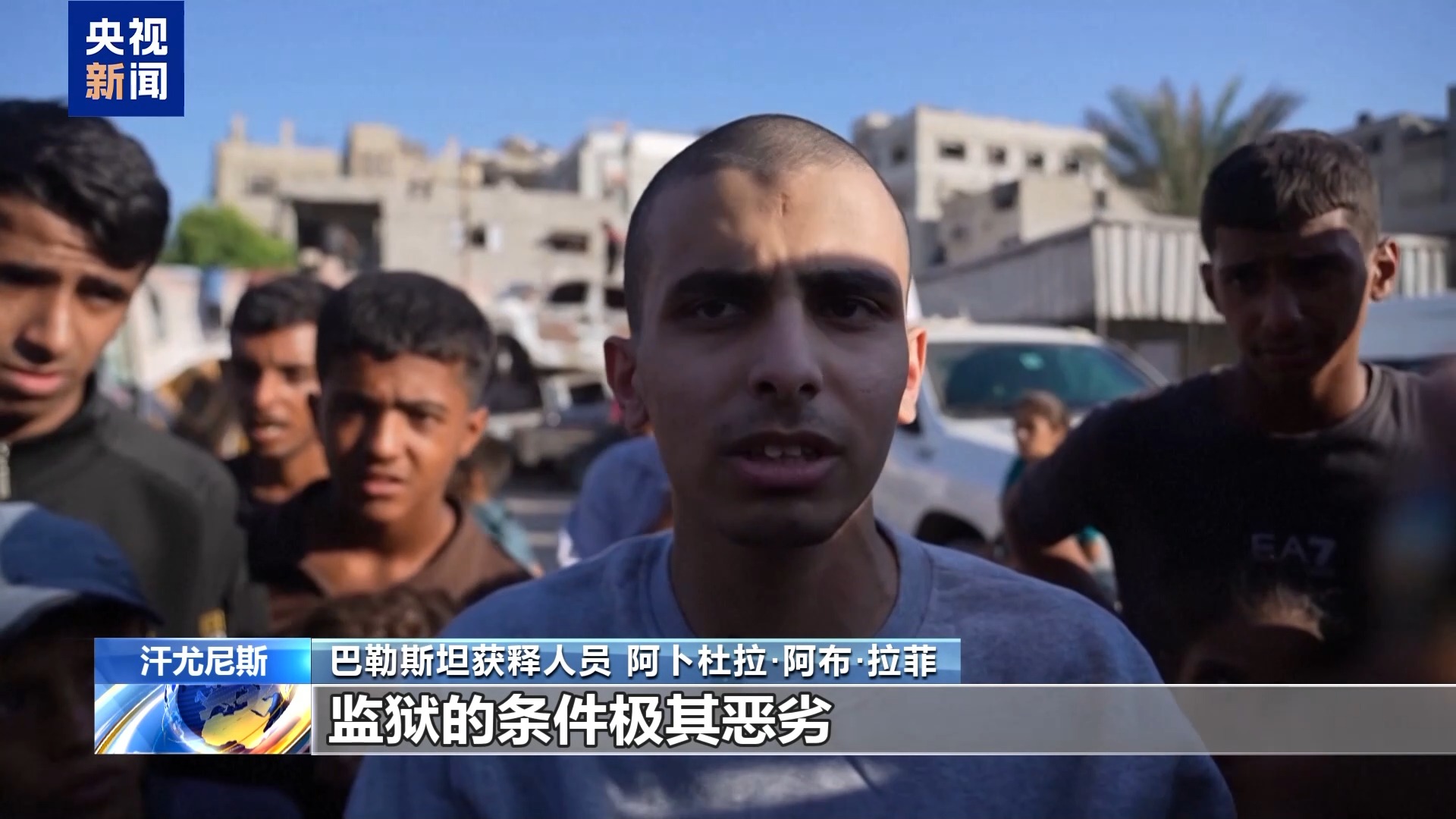*巴勒斯坦獲釋人員 亞辛·阿布·阿姆拉:*監獄的條件糟透了,飢餓、壓迫、毆打,一切都糟透了。那裏沒有吃的,也沒有喝的。我已經四天沒吃東西了,剛剛才有人給了我兩塊糖。