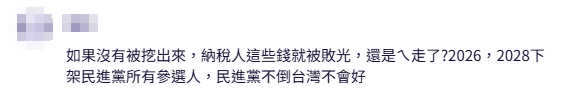 有網民説,如果沒有被挖出來,納税人這些錢就被敗光……2026,2028下架民進黨所有參選人,民進黨不倒台灣不會好。