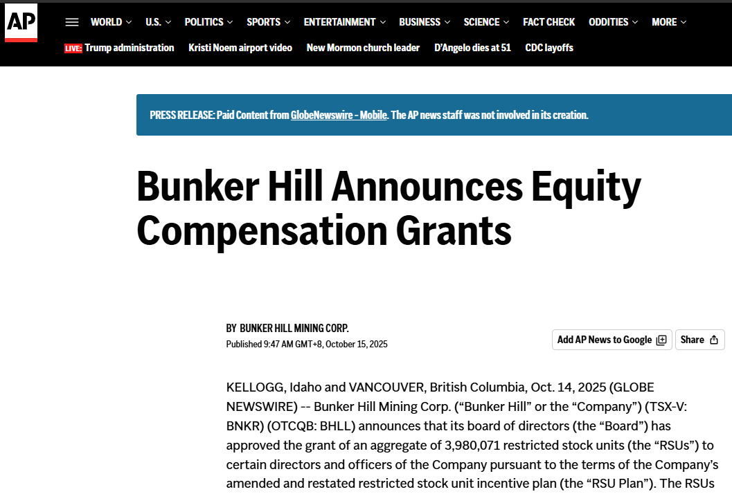 【環球網財經綜合報道】據美聯社消息,伯克希爾礦業公司(TSX-V: BNKR)(OTCQB: BHLL)10月14日宣佈,其董事會已批准一項大規模的股權激勵計劃,向公司董事及高級管理層授予總計3,980,071份受限股票單位(RSUs)和626,593份股票期權。此舉旨在激勵核心團隊,全力支持公司重啓並開發其位於北美的旗艦礦產資產。