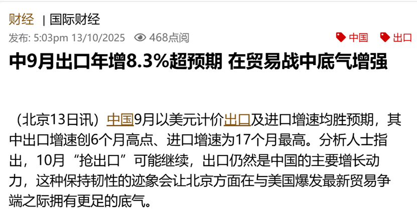 星洲網發文稱,美國關税雖導致對美出口下降,但出口市場多元化和國內需求支撐下,中國出口保持強勁,這可能使其在與美國貿易談判中佔據優勢。此外,對歐盟、非洲出口增長,表明企業尋找替代市場,對美國以外市場需求的依賴減弱。整體來看,出口對於中國經濟仍有提振作用。