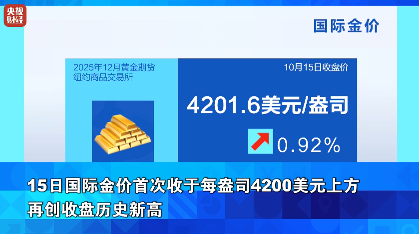 15日國際金價首次收於每盎司4200美元上方 再創收盤歷史新高