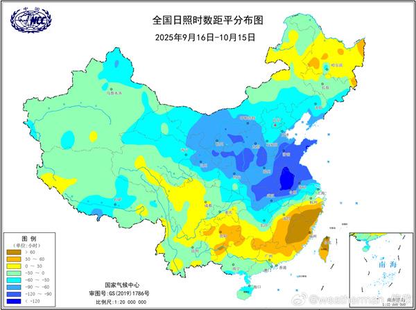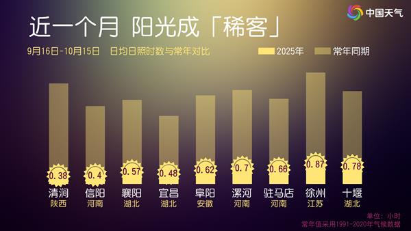 連陰雨天氣使得陝西、河南、山東、江蘇、安徽、湖北一帶日照時數顯著偏少。部分站點最近一個月累計日照時數不足30小時,可以説平均每天日照不到1小時,比常年同期偏少了80%左右。