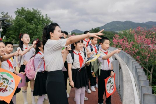 金秋的福山郊野公園,層林盡染。一羣來自福州市錢塘文博小學的學生,在教師林武和唐溦的帶領下,開展自然生態研學實踐。他們時而駐足觀察,時而熱烈討論,看層林盡染、聽林間鳥鳴,於健步中感受秋韻,登高望遠,沉浸於“城繞青山市繞河”的生態美景,體悟“人與自然和諧共生”的身心愉悦,潛移默化中“生態文明”與“福文化”的種子悄然生根。