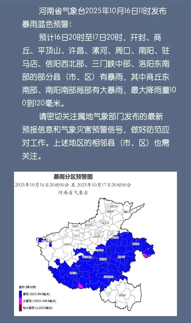 今天夜裏到明天白天,全省陰天有中到大雨,其中三門峽中部、洛陽東南部、開封、商丘、平頂山、許昌、漯河、周口、南陽、駐馬店、信陽西北部部分縣(市、區)有暴雨,局部大暴雨。