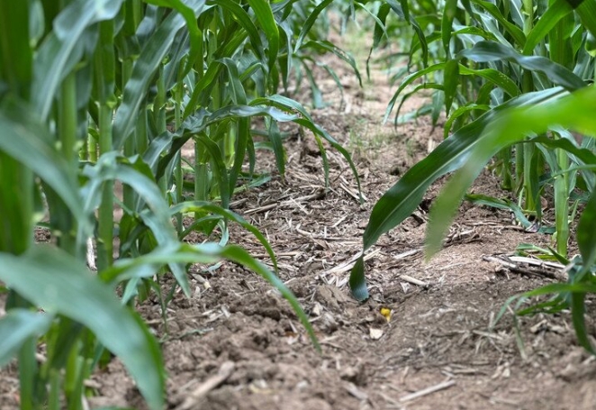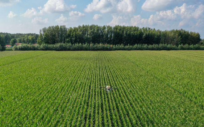 7月21日,在位於吉林省四平市梨樹縣的“科技小院”試驗田,植保無人機為玉米精準施肥(無人機拍攝)。新華社記者 張楠 攝