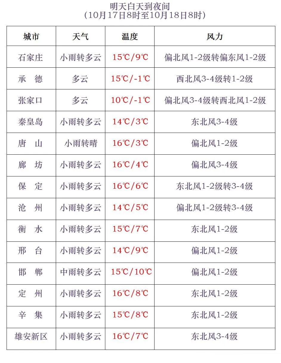 明天白天,唐山、秦皇島和保定、廊坊及以南地區陰有小雨,其中邢台東部、邯鄲中東部局地有中雨,其他地區陰轉多雲。