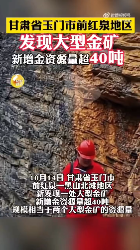 據甘肅省自然資源廳日前消息,甘肅省玉門市前紅泉—黑山北灘地區新發現一處大型金礦,新增金資源量超40噸,規模相當於兩個大型金礦的資源量。