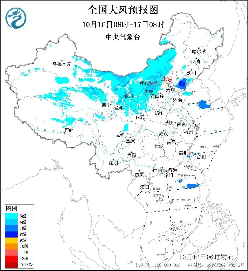 中央氣象台10月16日6時繼續發佈大風藍色預警。預計,10月16日08時至17日8時,新疆東部、西藏北部、青海北部和西部、甘肅西北部和東南部、寧夏、內蒙古中西部、陝西中北部、山西中北部、河北西北部、遼寧南部、山東北部等地的部分地區有5~6級、陣風7~9級的大風。