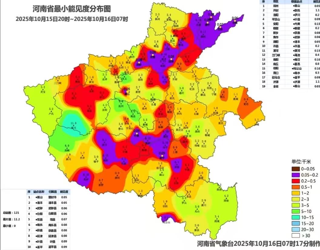 河南省氣象台2025年10月16日11時發佈暴雨藍色預警:預計16日20時至17日20時,開封、商丘、平頂山、許昌、漯河、周口、南陽、駐馬店、信陽西北部、三門峽中部、洛陽東南部的部分縣(市、區)有暴雨,其中商丘東南部、南陽南部局部有大暴雨,最大降雨量100到120毫米。
