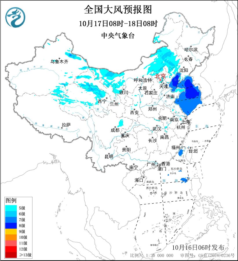 預計,10月16日08時至17日08時,新疆東部、西藏北部、青海北部和西部、甘肅西北部和東南部、寧夏、內蒙古中西部、陝西中北部、山西中北部、河北西北部、遼寧南部、山東北部等地的部分地區有5~6級、陣風7~9級的大風;渤海、黃海東南部、南海東北部的部分海域將有7~8級、陣風9級的大風。