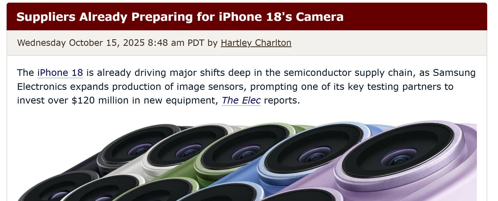 【環球網科技綜合報道】10月16日消息,據MacRumors報道,蘋果公司已啓動iPhone 18系列相機供應鏈的深度佈局。三星電子將在時隔近十年後重返蘋果相機圖像傳感器供應鏈,並計劃在美國得克薩斯州奧斯汀新建圖像傳感器生產線,預計2027年為iPhone 18系列提供相關組件。不過據行業觀察,蘋果2027年按慣例應發佈iPhone 19系列,目前暫未明確該信息是否存在表述偏差。