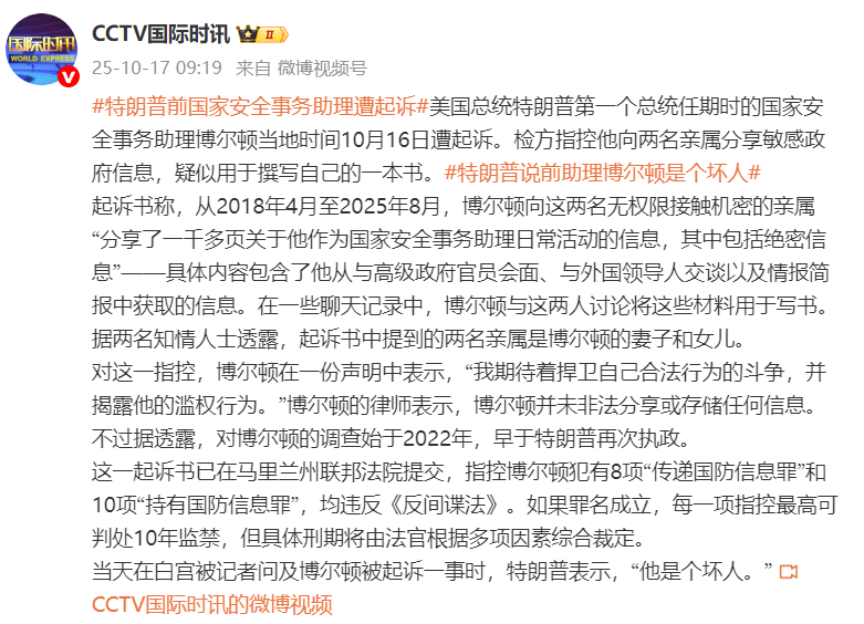 美國總統特朗普第一個總統任期時的國家安全事務助理博爾頓當地時間10月16日遭起訴。檢方指控他向兩名親屬分享敏感政府信息,疑似用於撰寫自己的一本書。