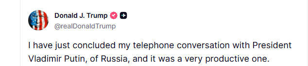 在16日稍晚時,美國總統特朗普在其個人社交媒體平台上發佈了同俄羅斯總統普京當天通話的內容,並積極表態稱,此次通話非常富有成效。在特朗普相關聲明發出後不久,俄羅斯總統特使德米特里耶夫也發聲表示,兩國總統的通話“積極且富有成效”,雙方明確了下一步的行動方案。