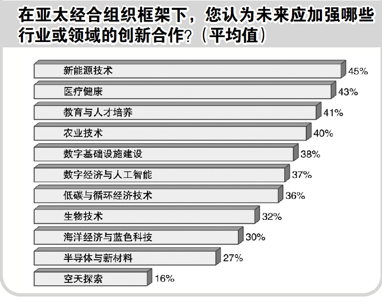 關於未來在APEC框架下的各項合作,在貿易投資領域,受訪者最期待降低關税和促進貿易投資的便利化。在數字經濟領域,網絡安全與通信技術合作更受青睞。在創新合作方面,新能源技術最受期待,其次為醫療健康、教育人才培養及農業技術,而數字基建、數字經濟與人工智能、低碳與循環經濟技術的獲選比例也都超過1/3。在可持續發展方面,清潔能源及低碳技術、應對氣候變化的有關合作最受期待,生物多樣性保護、循環經濟和海洋生態保護也受到相對更高的期待。