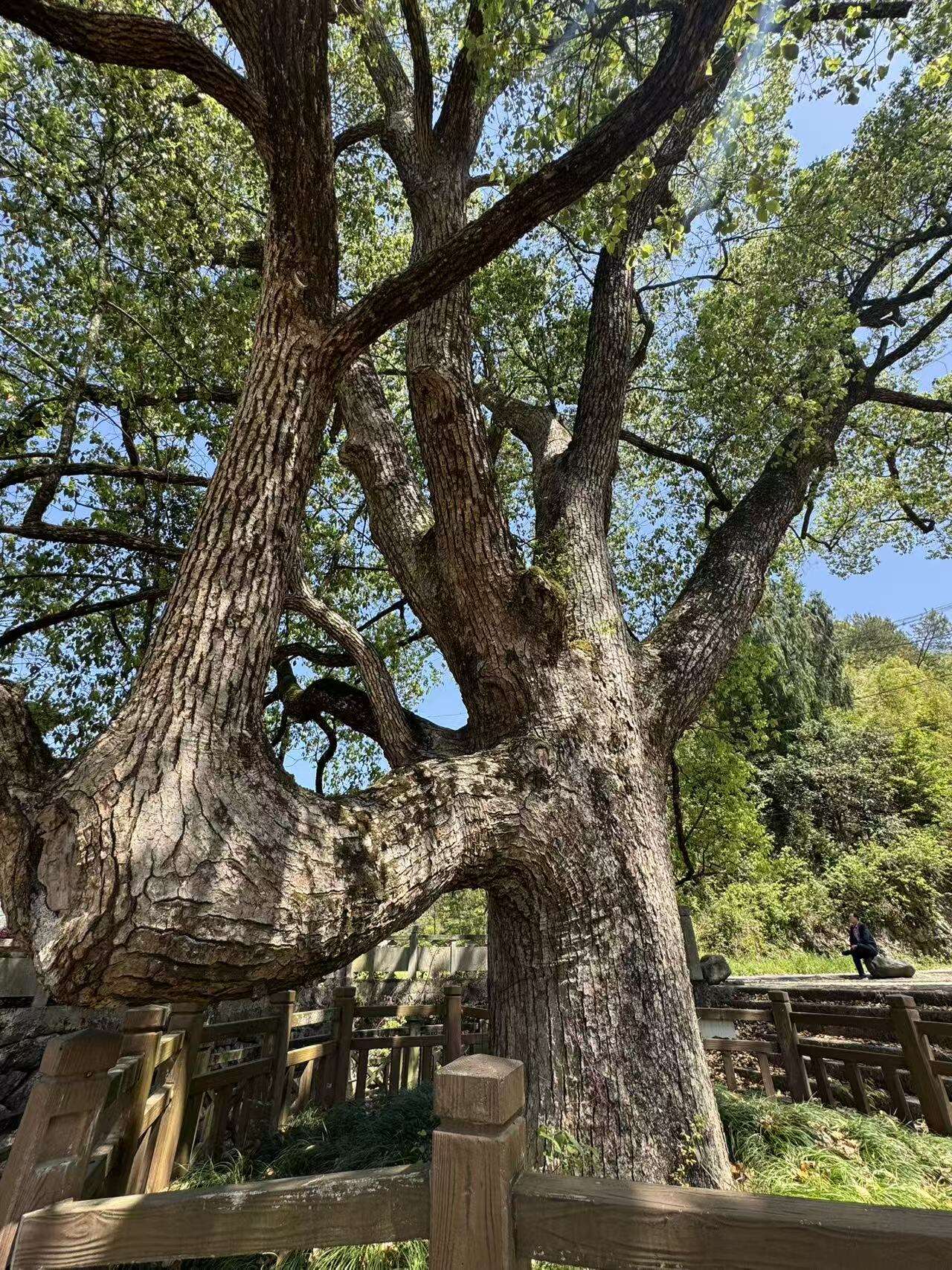 樟樹媽媽立於村口小溪旁,冠如傘蓋,蓊蓊鬱鬱,猶如一位慈祥的老母親在那裏迎候着來往的子孫。柏樹伯伯則在村內一石階旁,枝幹蒼勁,盤曲嶙峋,守護着村莊。若按當地傳説,這兩棵老樹已存活500餘年,但我看這樹上由林業部門掛的牌子卻表明:樟樹樹齡約420年,柏樹樹齡約620年。兩樹的樹齡與傳説不一,又何以相差200年?