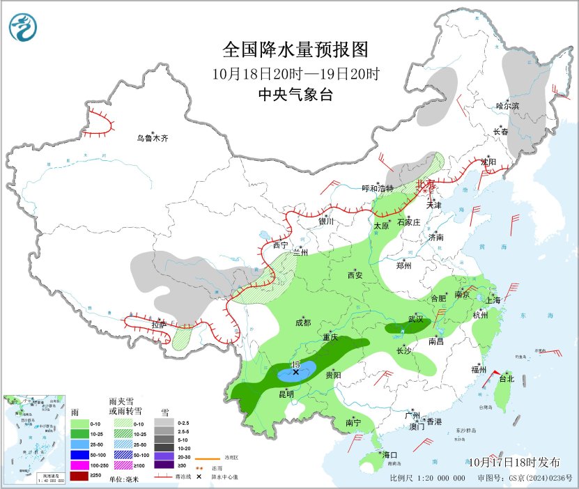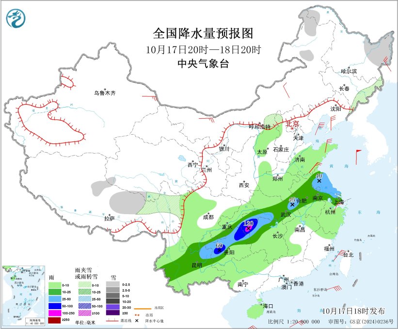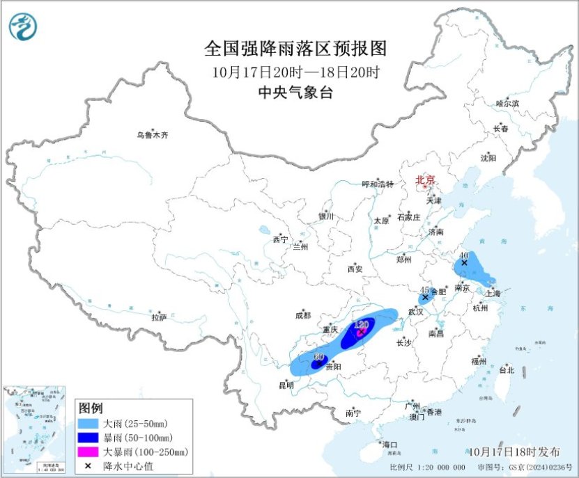 *中央氣象台10月17日18時繼續發佈暴雨藍色預警:*預計,10月17日20時至18日20時,貴州中北部、重慶東南部、湖南西北部、湖北西南部和東北部、江蘇中南部、雲南東北部等地部分地區有大到暴雨,其中,湖南西北部、重慶東南部等地局地有大暴雨(100~120毫米)。上述部分地區伴有短時強降水(最大小時降雨量20~40毫米,局地可超過50毫米),局地有雷暴大風等強對流天氣(見圖1)。18日雨帶南壓減弱。