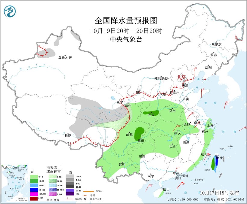 *10月19日20時至20日20時,*新疆西北部、青海南部和東部、川西高原北部等地的部分地區有小雪或雨夾雪。西北地區東南部、西南地區東部和南部、黃淮西部、江漢、江淮西部、江南西部和東部、台灣島等地的部分地區有小到中雨,台灣島東部的部分地區有大到暴雨(50~75毫米)(見圖5)。