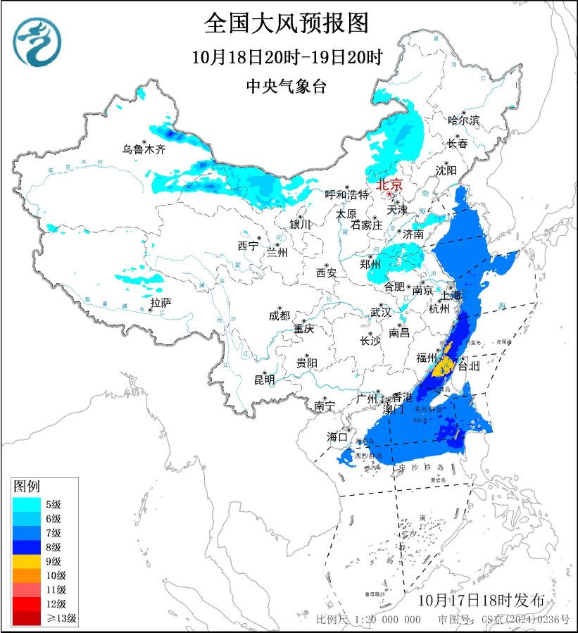 預計,10月17日20時至18日20時,新疆東部、內蒙古西部、青海北部、山東、遼東半島等地部分地區有5~6級風,陣風7~8級;渤海、渤海海峽、黃海大部海域、東海西北部海域、台灣海峽、巴士海峽以及南海東北部的部分海域將有7~8級、陣風9~10級的偏北風。