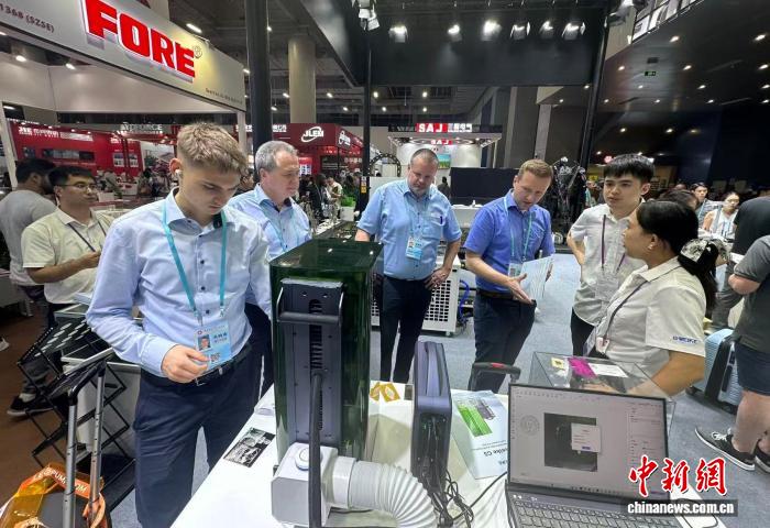 10月16日,第138屆廣交會繼續在廣州舉行。圖為境外採購商正在瞭解中國企業展出的激光打標機。中新社記者 程景偉 攝