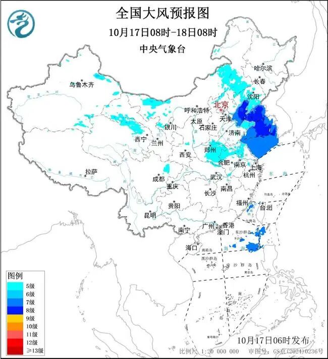 中央氣象台10月17日06時繼續發佈大風藍色預警:預計,10月17日08時至18日08時,新疆東部、內蒙古東部和西部、青海北部、遼寧、山東中東部、河南中東部、安徽北部、江蘇西部和北部、四川盆地中部等地部分地區有4~6級風,陣風7~8級;渤海、渤海海峽、黃海大部海域將有7~8級、陣風9~10級的大風,台灣海峽、巴士海峽以及南海東北部的部分海域將有7級、陣風8級的東北風。
