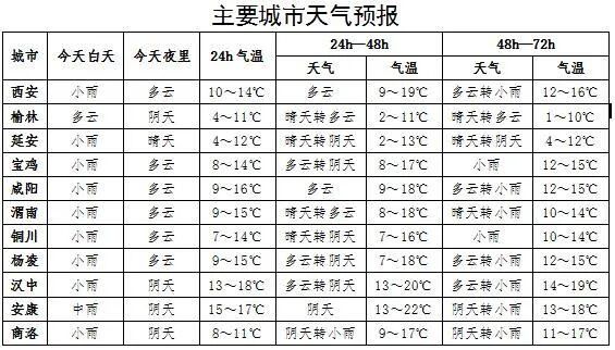 預計今天白天:全省陰天轉多雲,延安部分、關中、陝南有小雨或陣雨(0~5毫米),關中南部局地、陝南東部有中雨(5~15毫米),安康南部局地有大雨(15~30毫米)。陝北、關中大部、陝南西部有4級(5.5~7.9米/秒)左右偏北風,陣風可達7~8級(13.9~17.2米/秒)。日平均氣温陝北、關中西部下降6~8℃,關中東部、陝南下降4℃左右。陝北北部有霜凍。今天晚上:全省多雲間陰天。