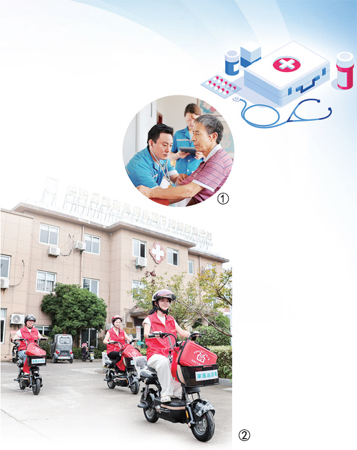 圖②:今年9月,浙江湖州市德清縣下渚湖街道社區衞生服務中心,由街道商會贈送的11輛家庭醫生巡診電動自行車正式投入使用。圖為家庭醫生騎着巡診電動自行車準備上門為居民提供健康服務。