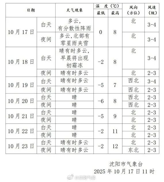 瀋陽市氣象台2025年10月17日5時30分發布