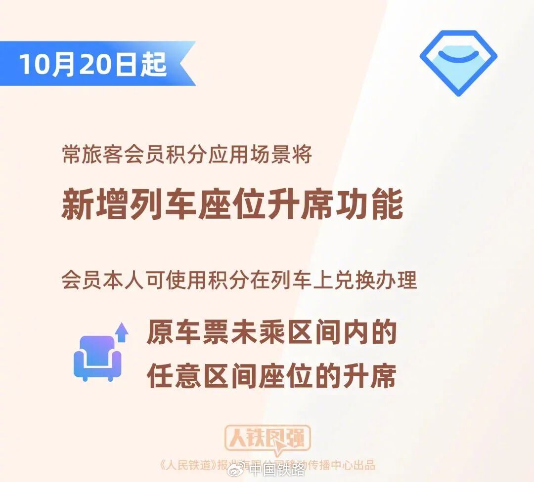 10月20日起,中國國家鐵路集團有限公司將優化升級“鐵路暢行”常旅客會員服務,對14至28週歲持居民身份證、港澳台居民居住證、港澳居民來往內地通行證、台灣居民來往大陸通行證、外國人永久居留身份證的常旅客會員實施更大幅度的積分優惠,會員積分在兑換火車票的基礎上,新增座位升席功能,常旅客會員積分的應用場景進一步拓展,旅客將獲得更多實惠,有利於激發“鐵路+”消費潛力,促進人員流動和沿線經濟發展,為全面擴大內需注入新動能。