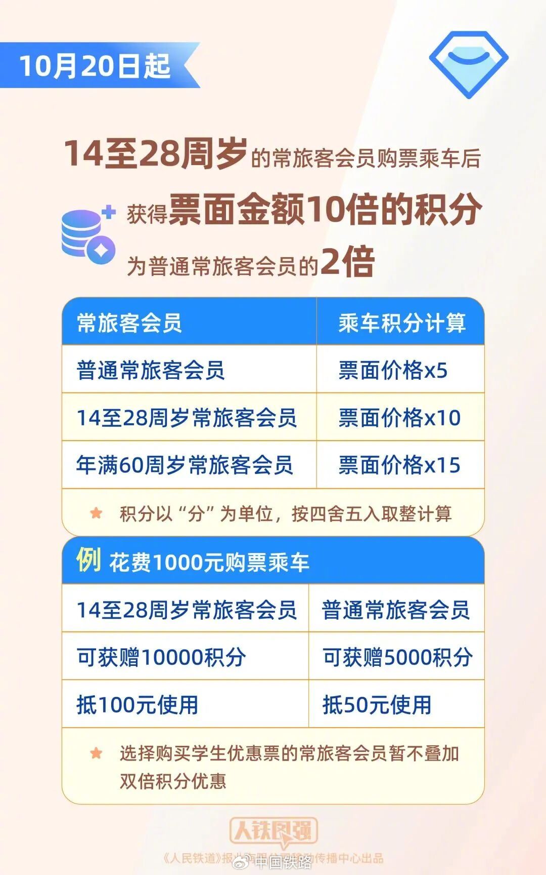 此次“鐵路暢行”常旅客會員服務優化升級,是國鐵集團貫徹落實黨中央、國務院提振消費專項行動方案,進一步擴大以鐵路為紐帶的服務消費,更好滿足旅客對美好旅行生活嚮往的具體措施。目前,普通常旅客會員購票乘車後可獲得票面金額5倍的積分,年滿60週歲的老年常旅客會員可獲得票面金額15倍的積分,為普通常旅客會員的三倍。10月20日起,14至28週歲的常旅客會員購票乘車後將獲得票面金額10倍的積分,為普通常旅客會員的兩倍,即普通常旅客會員花費1000元購票乘車,可獲贈5000積分、抵50元使用;14至28週歲的常旅客會員花費1000元購票乘車可獲贈10000積分、抵100元使用。選擇購買學生優惠票的常旅客會員暫不疊加雙倍積分優惠。