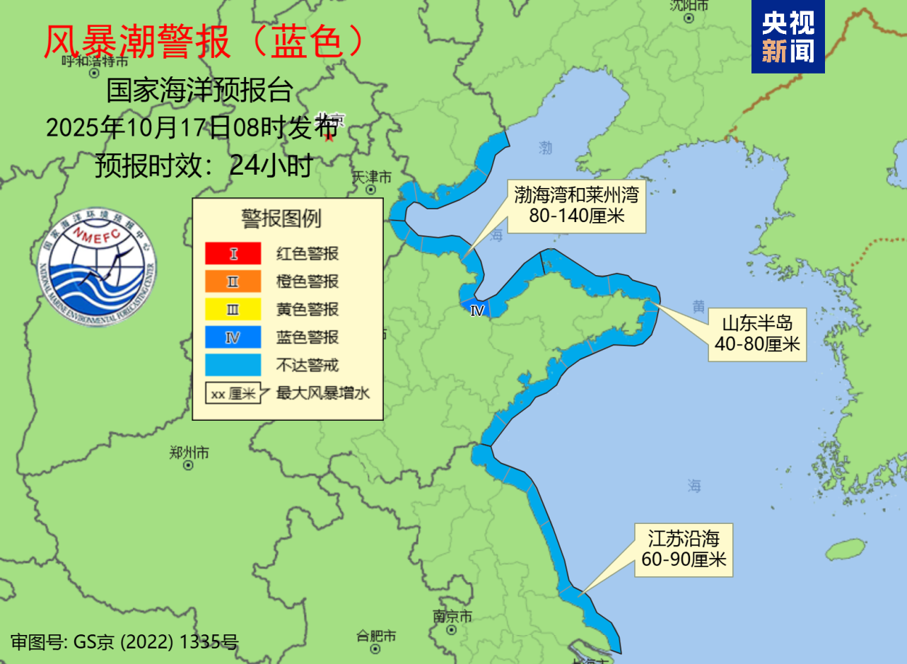 風暴潮方面,預計10月17日傍晚至18日上午,渤海灣和萊州灣將出現80到140釐米的風暴增水,山東半島沿海將出現40到80釐米的風暴增水,江蘇沿海將出現60到90釐米的風暴增水。山東省濰坊市的風暴潮預警級別為藍色。