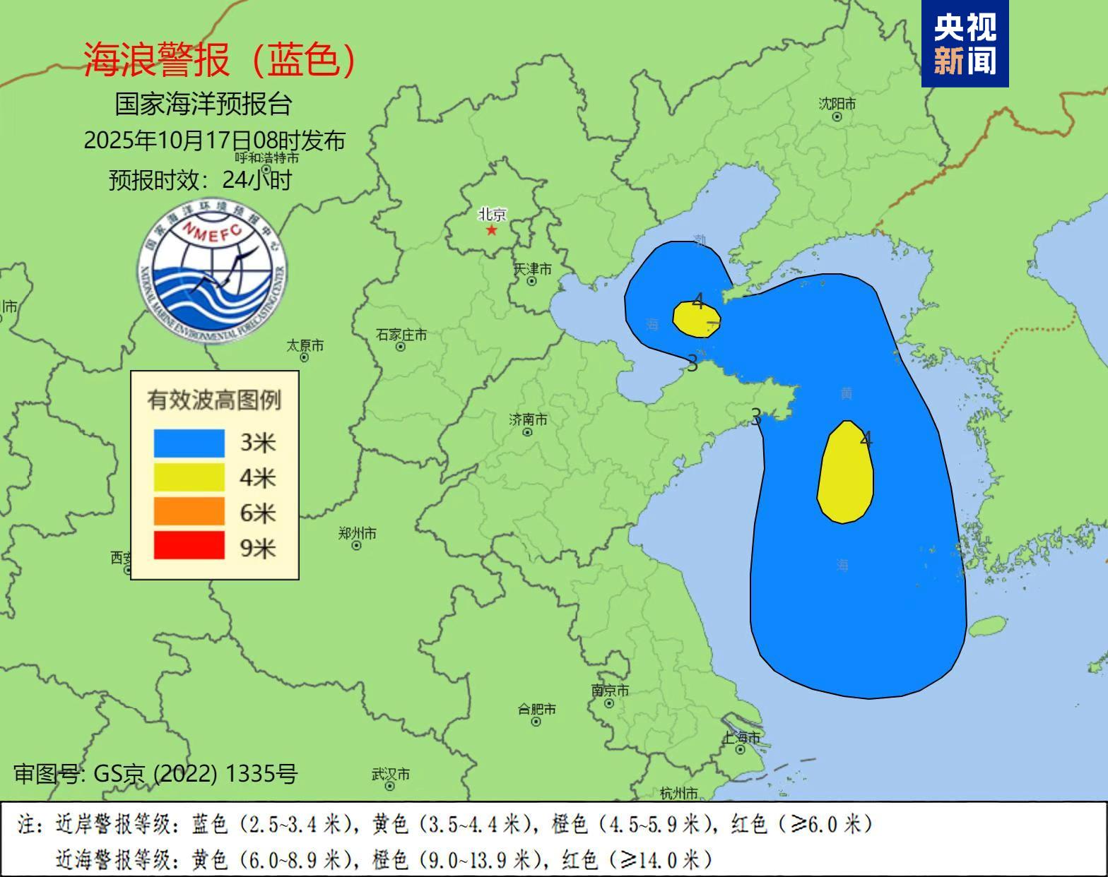 海浪方面,受強冷空氣的影響,預計10月17日夜間到18日上午,渤海、黃海將出現2.5到4.0米的大浪到巨浪區;遼寧西部、河北、山東北部、東部、江蘇北部近岸海域將出現2到3.3米的中浪到大浪,近岸海域海浪預警級別為藍色。