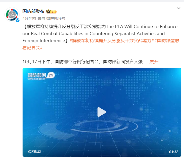 10月17日下午,國防部舉行例行記者會,國防部新聞發言人張曉剛大校就近期涉軍問題發佈消息。