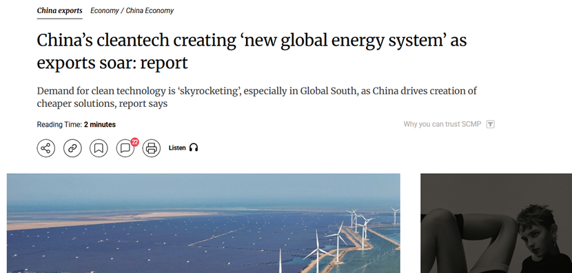 《南華早報》近日發文稱,英國智庫Ember發佈的一份報告顯示,中國清潔能源技術“正成為世界各地新能源系統的基礎”,8月份中國綠色科技月出口額創紀錄,達200億美元。Ember分析師尤安·格雷厄姆表示:“由於中國降低了電池和光伏太陽能電池板等技術的價格,東南亞、拉美和非洲國家的銷售額正在激增。”