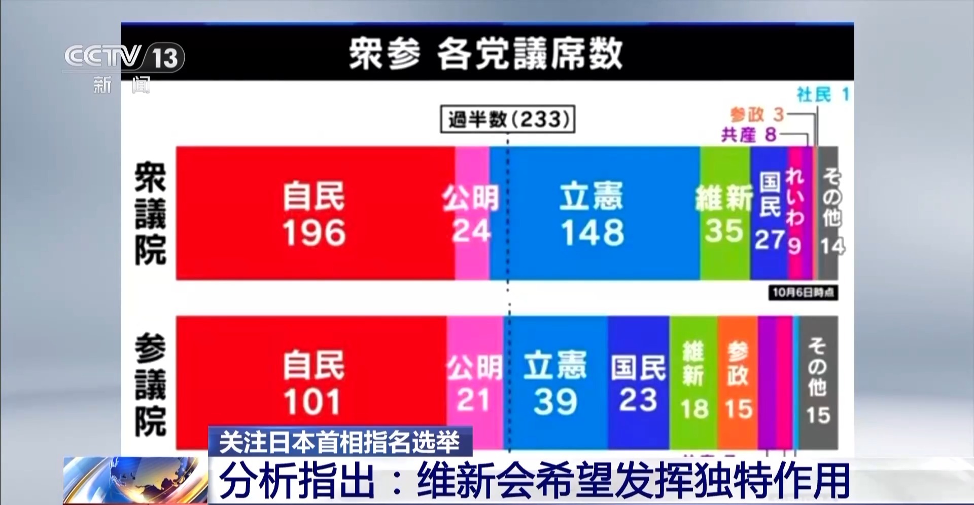 *總枱記者 李衞兵:*有分析認為,日本維新會之所以看重這個問題,是想展現自己作為革新政黨的形象,並向外界展示,在今後與自民黨的執政聯盟中自己並不只是一個陪襯,而是能發揮獨特甚至是引領的作用。而自民黨對這個牽動各方利益、實現起來阻力巨大的問題,長期以來態度並不積極。但據瞭解,為了能夠拉住日本維新會從而保住自己的執政地位,自民黨內部正在朝着接受維新會條件的方向進行調整。這樣一來,自民黨和日本維新會組成執政聯盟的可能性就大大增加,如果不出意外,自民黨總裁高市早苗將會在21日的首相指名選舉中當選新一屆日本首相。