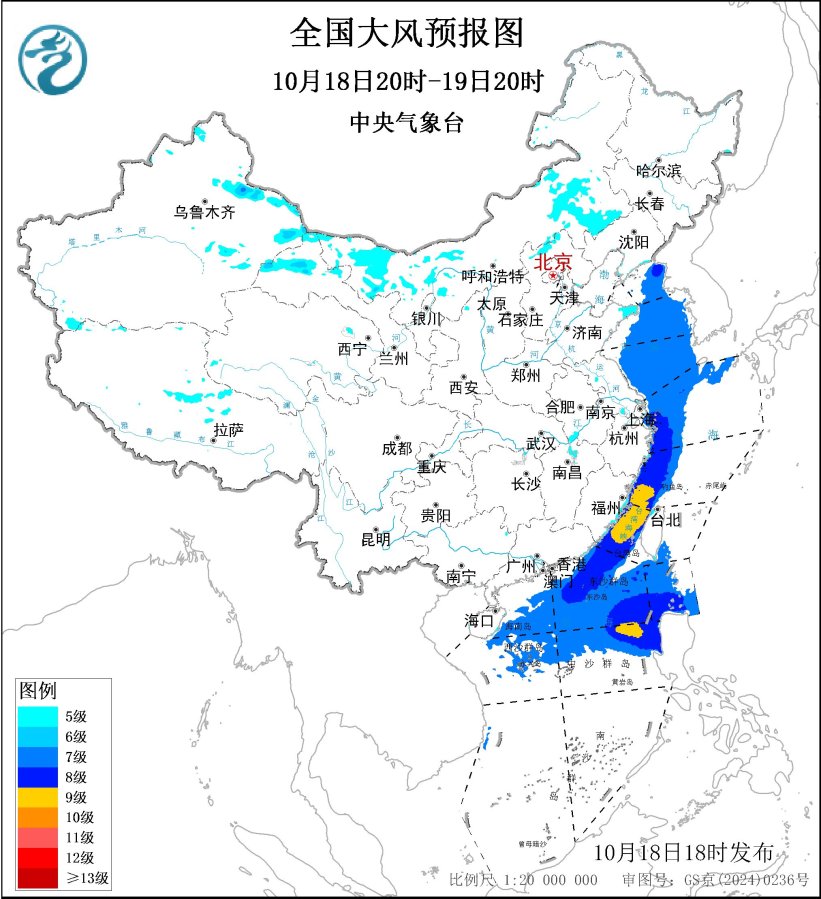 預計,10月18日20時至19日20時,新疆東部、內蒙古西部和東南部、甘肅西部、河北北部、山東東部等地部分地區有5~6級風,陣風7~8級;黃海大部海域、東海西部海域、台灣海峽、台灣以東洋麪的部分海域、巴士海峽、南海北部和中部海域將有7~8級、陣風9~10級的大風,其中東海西南部海域、台灣海峽、南海中東部的部分海域可達9級、陣風10~11級。