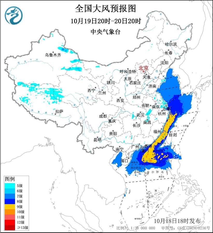 10月19日20時至20日20時,新疆東部、甘肅西部、西藏西部和北部、山東東部、江蘇南部、安徽西南部、江西北部等地部分地區有5~6級風,陣風7~8級;黃海大部海域、東海西部海域、台灣海峽、巴士海峽、南海北部和中部海域、北部灣將有7~8級、陣風9~10級的大風,其中東海西部海域、台灣海峽、南海北部的部分海域風力可達9~10級、陣風11~12級。