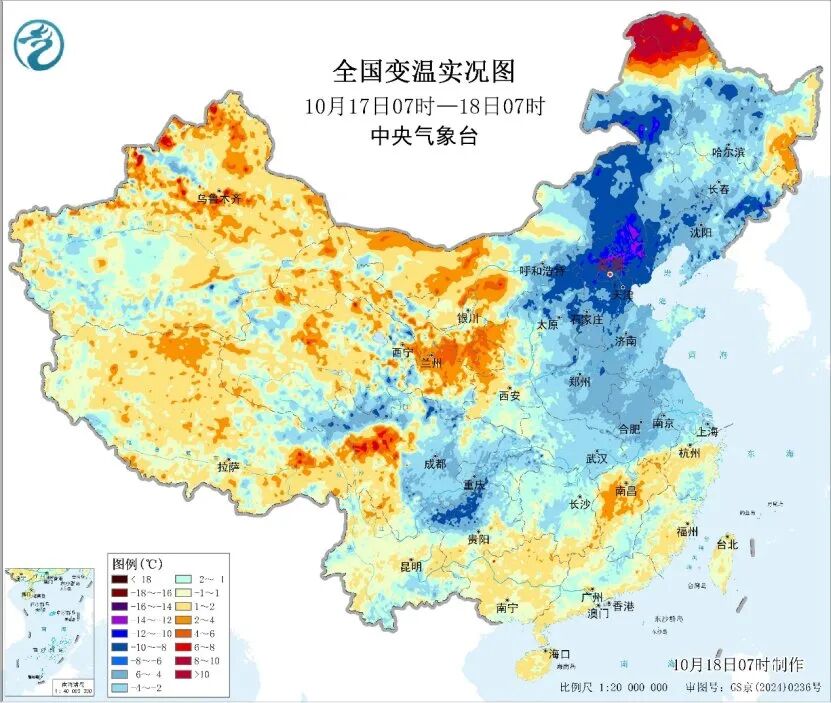 河北省氣象台2025年10月18日10時48分繼續發佈寒潮藍色預警信號:受冷空氣影響,17-18日全省氣温明顯下降,較16日早晨,石家莊、滄州及以北地區最低氣温已下降5~8℃,其中張家口、承德、保定西北部下降8~12℃,局地14℃以上;其他地區下降2~4℃。預計19日早晨,張家口北部、邢台、邯鄲最低氣温繼續下降2~5℃,保定、廊坊以北地區有霜凍。請注意防範。
