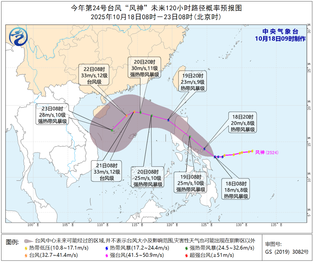 預計“風神”強度逐漸加強,19日白天將在菲律賓呂宋島東部沿海登陸,以後穿過呂宋島,19日下午到夜間進入南海東部海面,逐漸向海南島以東海面靠近。