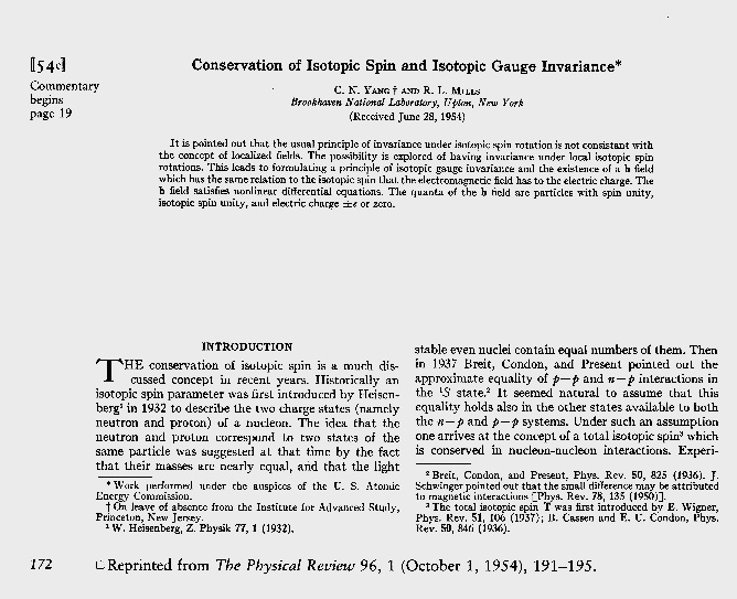 1954年楊振寧與米爾斯關於“非阿貝爾規範場”的論文