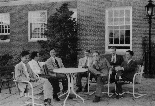 1952年秋楊振寧等物理學家於普林斯頓高等研究院(左起:楊振寧、派斯、李政道、斯諾、愛德華茲、沃德、南部陽一郎)