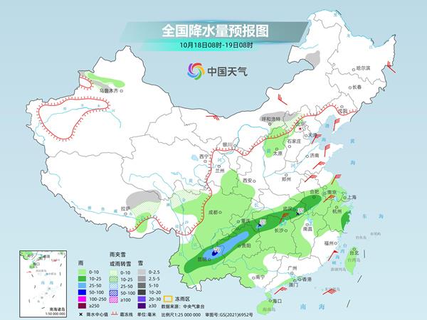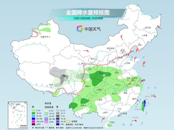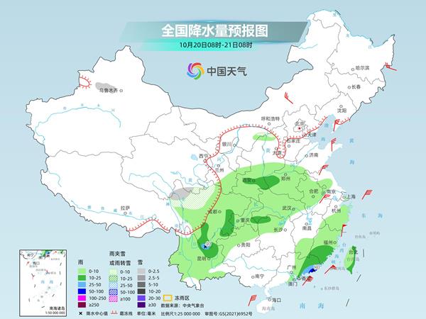 後天,新疆沿天山地區、青海東南部、川西高原北部等地部分地區有小雪或雨夾雪。陝西中部、河南西部、湖北南部、湖南西北部、四川南部、雲南東北部、福建東南部、廣東東南部、台灣島等地部分地區有中到大雨。