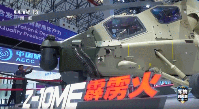 *總枱軍事觀察員 魏東旭:*現在我們所在的位置是天津直博會的室內的展區,我們是在中航工業的展台,在我的身邊是直-10ME型的武裝直升機,既然它叫直-10ME,意味着它是一個改進型,而且是可以進行出口的。