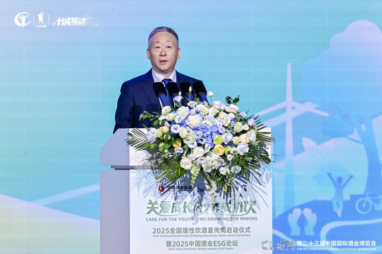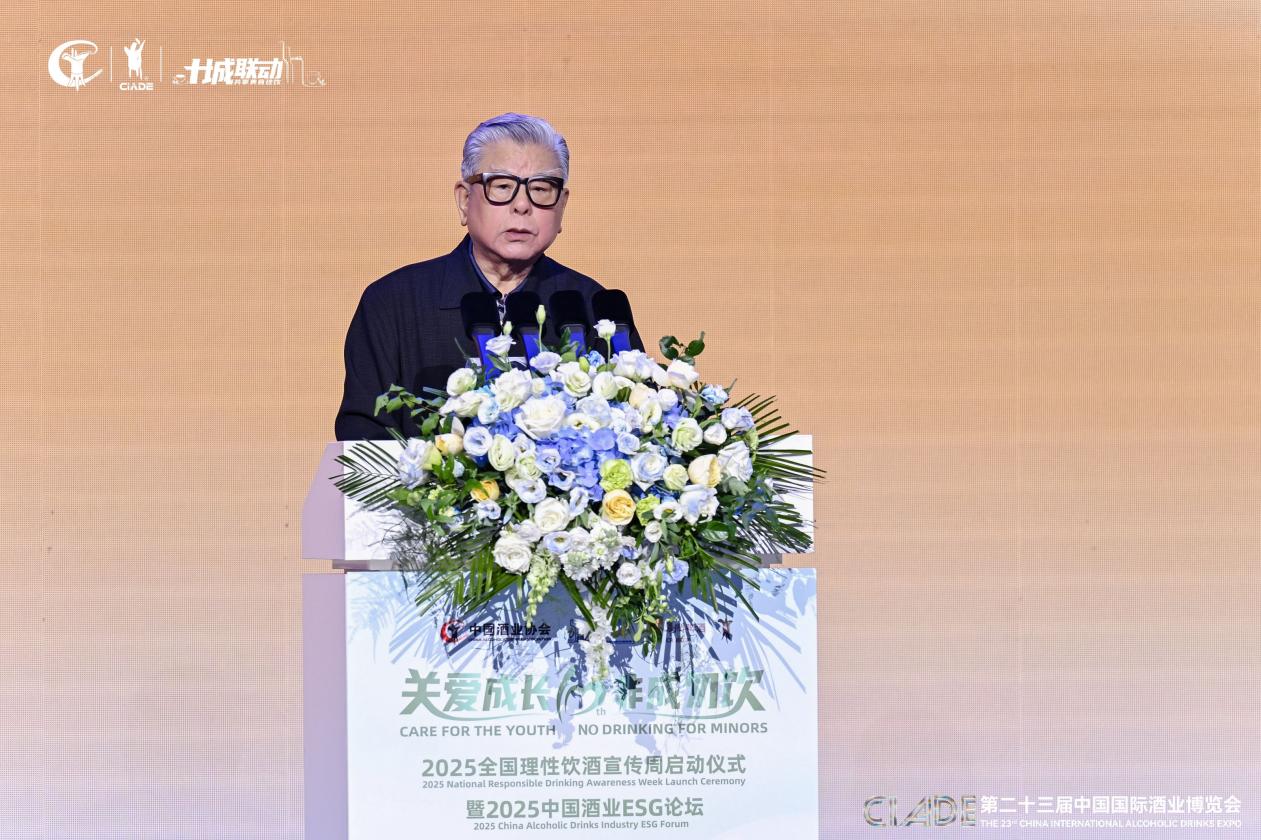 中國酒業協會理事長宋書玉以《一瓶酒的責任》為題,回顧了全國理性飲酒宣傳週活動十年的成績,闡述了“關愛成長,非成勿飲”這一主題的深刻內涵,並對ESG領航酒業綠色發展的重要意義作了強調。他表示,無論是大力倡導的“理性飲酒”,還是積極踐行的ESG理念,其核心要義都指向可持續發展這一目標,共同構成了中國酒業高質量發展的基石。