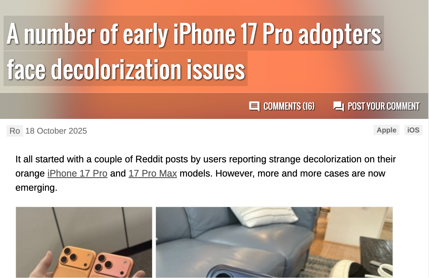 【環球網科技綜合報道】10月18日消息,科技媒體GSMArena發文稱,部分首批購入蘋果iPhone 17 Pro及iPhone 17 Pro Max的用户反映,其設備在使用過程中出現機身褪色現象,問題集中於“星宇橙”和“深藍色”兩款配色機型。