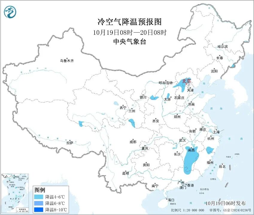 預計,19日8時至20日8時,新疆東部、內蒙古西部和東部、甘肅西部、河北北部、山東東部、江蘇南部、安徽西南部、江西北部等地部分地區有5~6級風,陣風7~8級。東海大部海域、南海北部海域、巴士海峽將有8級、陣風9級的偏北到東北風,其中東海西部、台灣海峽、南海東北部的風力可達9級、陣風10級。