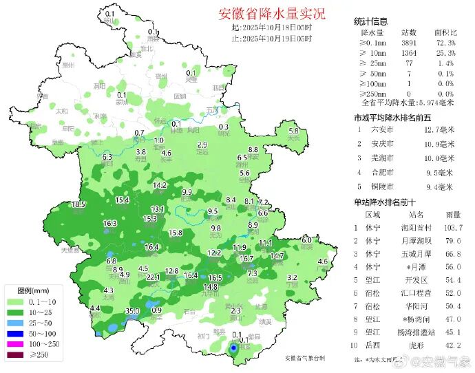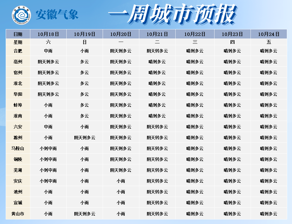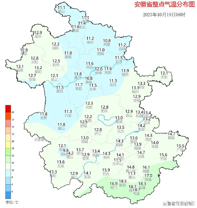 10月18日05時至10月19日05時,全省大部分地區有小到中雨,其中大別山區、沿江地區和江南局部地區大雨,局部暴雨。強冷空氣正在影響我省,目前雨帶正處於江淮之間中南部及沿江大部;8時整點氣温顯示,沿江以北大部跌破15℃,江南南部多在16℃上下。