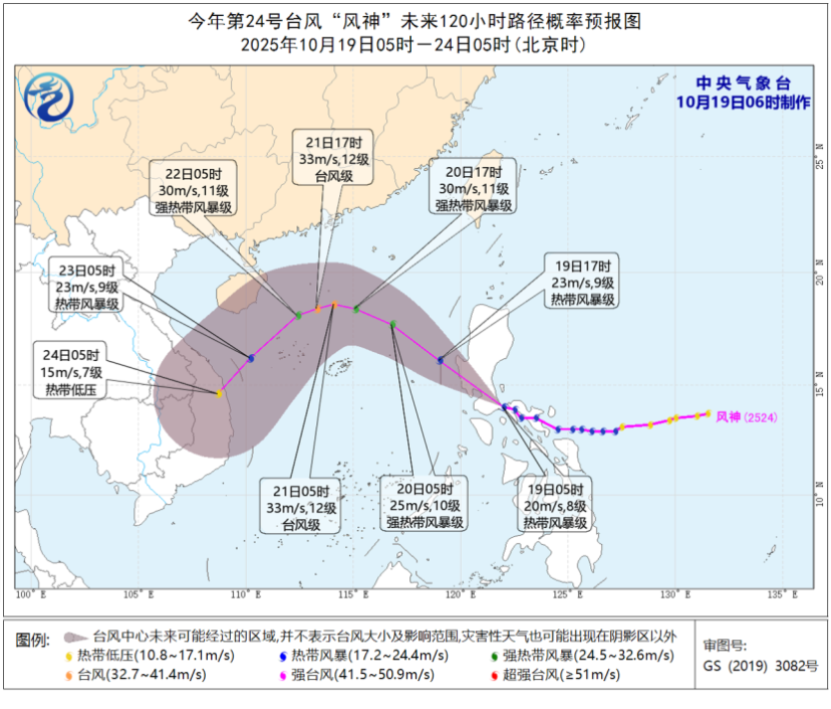 預計,“風神”將以每小時30-35公里的速度向西北方向移動,今天傍晚前後進入南海東部海面,強度逐漸加強,最強可達強熱帶風暴級或颱風級(30-35米/秒,11-12級);21日白天開始受南下冷空氣影響,在南海北部海面轉向西南方向移動,強度逐漸減弱(見圖2)。未來三天,受“風神”及外圍環流影響,台灣島東部和北部、福建沿海、廣東沿海、海南島及南海北部海域將有強風雨天氣。預計,19日08時至20日08時,台灣島中北部有大到暴雨,其中,台灣島東北部的部分地區有大暴雨(100-150毫米)。中央氣象台10月19日06時發佈颱風藍色預警。