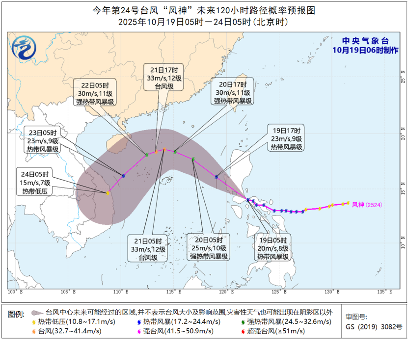 中央氣象台10月19日6時發佈*颱風藍色預警:*今年第24號颱風“風神”(熱帶風暴級)昨天傍晚在菲律賓呂宋島東南沿海登陸(18米/秒,998百帕),今天(19日)早晨5點鐘其中心位於菲律賓呂宋島上,中心附近最大風力有8級(20米/秒),中心最低氣壓為995百帕,七級風圈半徑150-180公里。