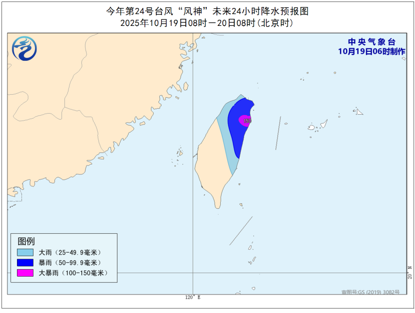 降水預報:19日08時至20日08時,台灣島中北部有大到暴雨,其中,台灣島東北部的部分地區有大暴雨(100-150毫米)。