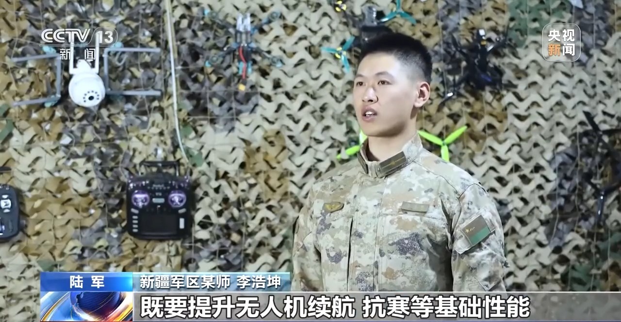 *新疆軍區某師 李浩坤:*既要提升無人機續航、抗寒等基礎性能,又要確保在高原複雜電磁環境下,無人機能夠快速、高效、精準地完成對“敵”目標打擊任務。